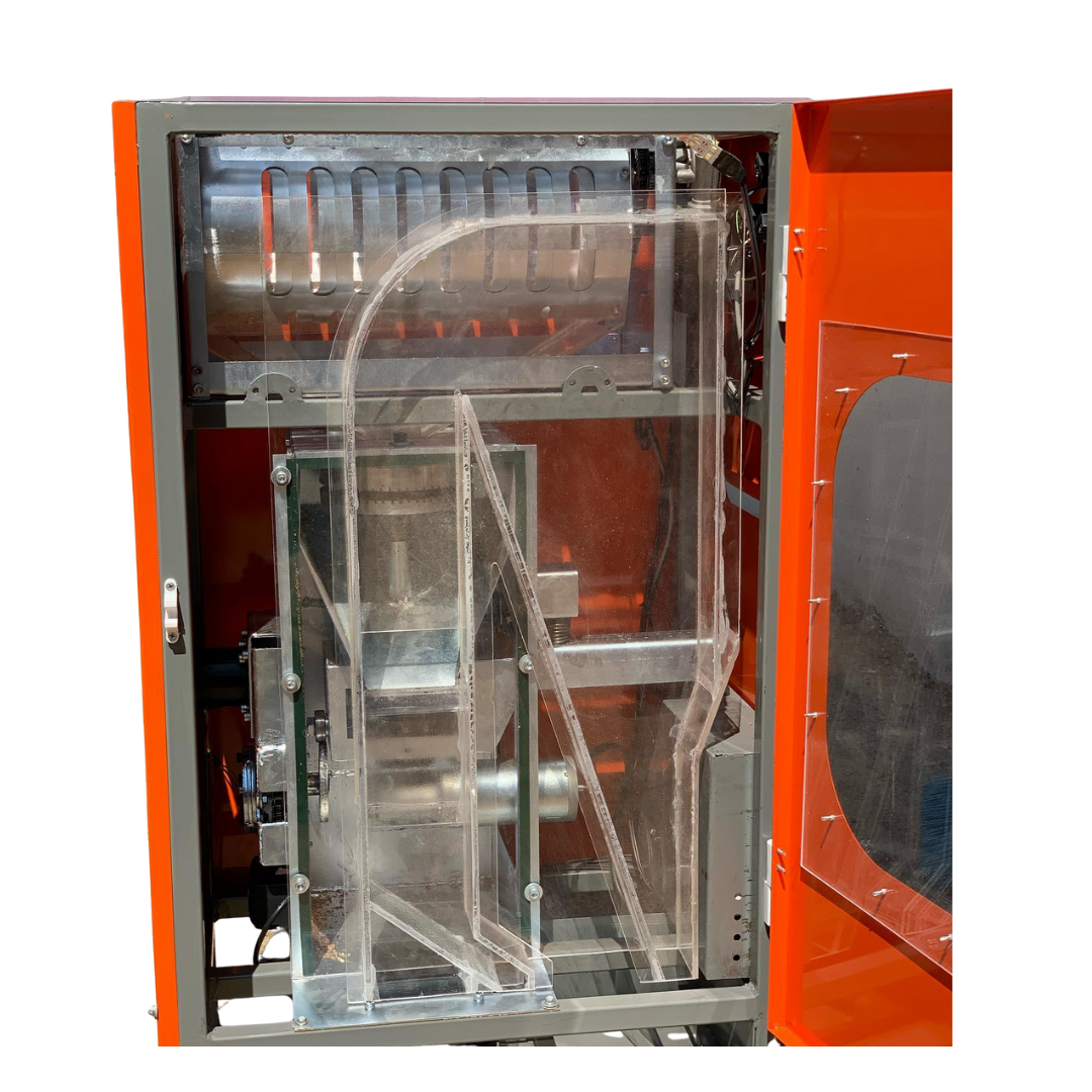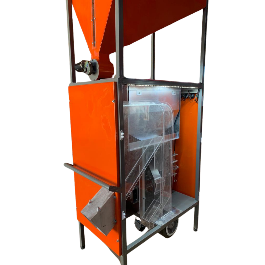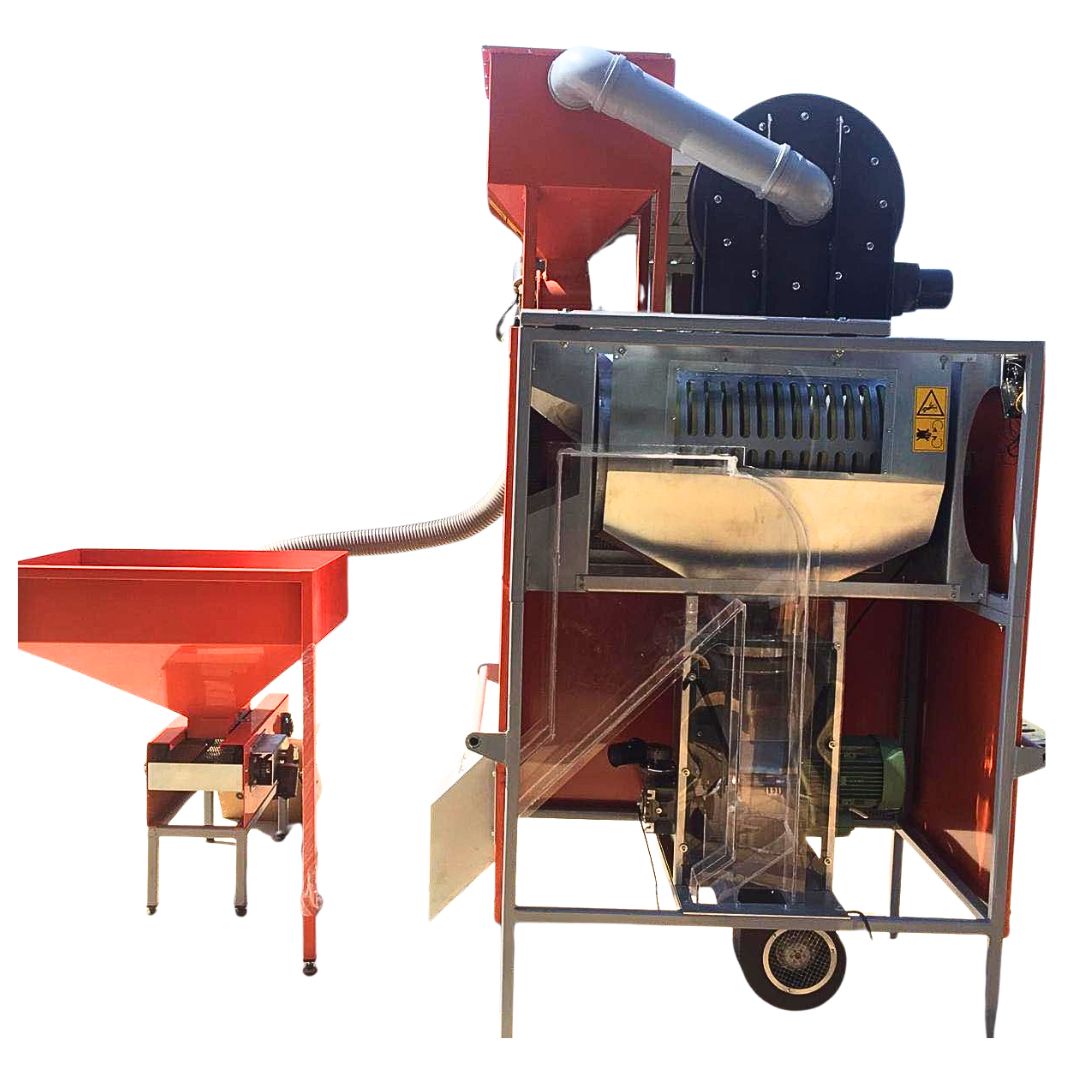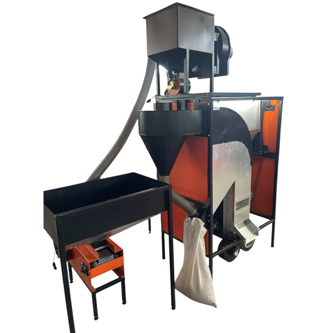 Машина для раскалывания фундука используется для разбивания твердой скорлупы орехов, после чего машина отделяет скорлупу от ядер орехов. В конце процесса разбитые кусочки скорлупы собираются, а ядра орехов собираются отдельно друг от друга. В зависимости от требуемой производительности, можно добавить дополнительную систему подачи воздуха для подачи орехов в загрузочный бункер машины для раскалывания орехов.